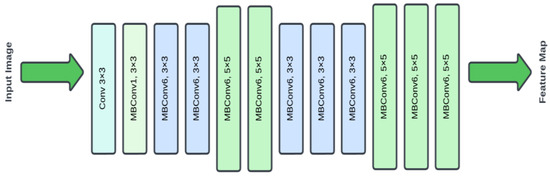 The EfficientNet design starts with a 3 × 3 convolutional layer, then numerous mobile inverted bottleneck (MBConv) blocks with different kernel sizes and expansion factors (as shown in Figure 8). The design employs a mix of 3 × 3 and 5 × 5 MBConv blocks to efficiently record spatial characteristics at various sizes. Each MBConv block is composed of a depth wise convolution followed by a pointwise convolution, allowing the model to capture complicated patterns while being computationally efficient. The network gradually raises the number of filters and the resolution of feature maps using these MBConv blocks, resulting in a highly detailed and rich feature map. This architecture strikes a compromise between depth, breadth, and resolution, producing an efficient and strong model for picture categorization tasks.
