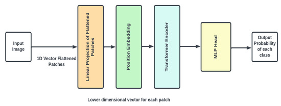 The vision transformer (ViT) architecture (as shown in Figure 9) divides an input picture into fixed-size, non-overlapping patches, which are then flattened into a 1D vector (as shown in Figure 9). The vectors are then projected linearly onto a lower-dimensional space. Position embeddings are applied to these vectors in order to keep the positioning information of the patches inside the original picture. The generated sequence is routed through a transformer encoder, which consists of many layers of multi-head self-attention mechanisms and feed-forward neural networks. This encoder captures both the global environment and the interactions between patches. The output of the transformer encoder is then passed into a multi-layer perceptron (MLP) head, which computes the final predicted probability for each class. This design enables ViT to harness the benefits of transformers in collecting long-range relationships and global picture context.