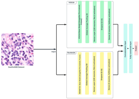 In this research, ensemble model architecture was used using ResNet34 and VGGNet16 as basis models. Figure 10 shows the proposed ensemble, which comprises both ResNet34 and VGGNet16. Initially, each model was trained independently to determine its unique performance. We then selected the best-performing epochs for each model based on validation accuracy. The best-performing epochs were then used to build the ensemble model. To improve the robustness and generalizability of the ensemble techniques, cross-validation was used. During each fold of the cross-validation approach, the research utilized the best weights from the previous folds to train the ensemble. For example, if cross-validation was undertaken on fold 1, the best epochs from folds 2, 3, 4, and 5 of ResNet34 and VGGNet16 were used to establish the ensemble model. The ensemble model architecture was created to leverage the complementary characteristics of ResNet34 and VGGNet16. ResNet34, with its residual connections, successfully mitigates the vanishing gradient problem, allowing for deeper network training. In contrast, VGGNet16, noted for its simplicity and constant layer architecture, excels in capturing fine-grained characteristics. By integrating both models, the ensemble makes use of VGGNet16’s comprehensive feature extraction and ResNet34’s depth-wise learning capabilities. Training the ensemble model entailed freezing the early layers of both base models to preserve their pre-trained feature extraction capabilities while fine-tuning the subsequent layers to fit them to the unique dataset. This hybrid strategy enabled the ensemble model to outperform individual models, as indicated by the improved accuracy and resilience across many validation criteria. In summary, the proposed ensemble model, which includes ResNet34 and VGGNet16, showed considerable performance increases. The strategic use of cross-validation and the incorporation of complementary model architectures demonstrate the effectiveness of ensemble techniques in deep learning applications.