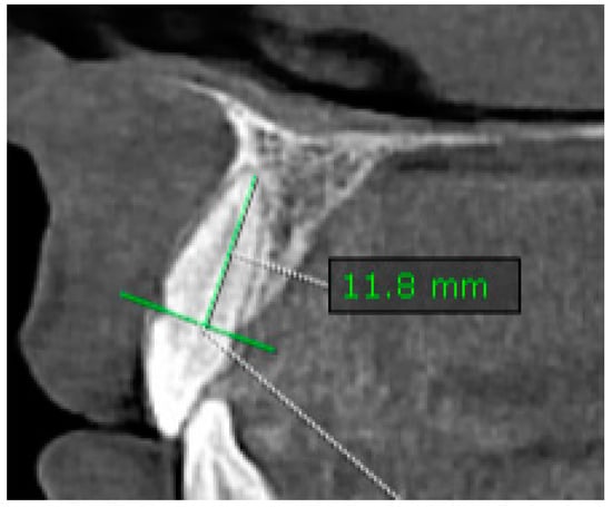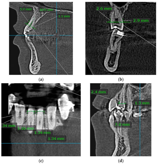 The CBCT scans of the patients included in the study were captured using KaVo OP 3D equipment (Kavo Ltd., Charlotte, NC, USA), with the following settings: KaVo OP 3DI tube voltage of 90 kV, tube current of 6 mA, field of view (FOV) of 8 × 15 cm, and standard resolution (voxel size 200 µm). Each scan was performed with the subject in a seated upright position, with the Frankfurt plane parallel to the floor, while the midsagittal plane was perpendicular to the ground, in maximum intercuspation. The OnDemand 3D dental software, version 1.0 (Cybermed, Daejeon, Republic of Korea), with DICOM format, was used to view and analyze the parameters required for the study. CBCT imaging was recorded before (T0) and after (T1) orthodontic treatment. The measurements were performed in a blinded manner by one of the authors in order to avoid measurement bias. T1 measurements were performed at different time points, without access to T0 values.
