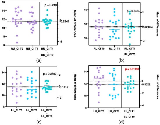 Distribution graph of the paired t-test for root resorption with p-value set at 0.05. Results at T0 and T1 for right upper central incisor (RU_CI) (a), right lower central incisor (RL_CI) (b), left lower central incisor (LL_CI) (c), and upper central incisor (LU_CI) (d).