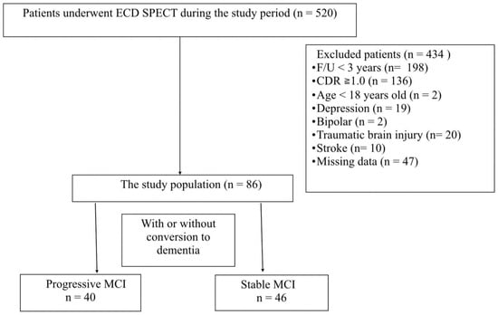 We conducted a retrospective study of MCI individuals who visited the memory clinic at the National Cheng Kung University Hospital (NCKUH) from January 2017 to December 2019. All patients on their first visit were over 50 and presenting with slowly progressive memory impairment, but not demented. Their history was confirmed by credible informants. Those with major depression or other psychiatric disorders and a history of traumatic brain injury or stroke were excluded. All underwent laboratory tests, including complete blood count (CBC), aspartate aminotransferase (AST), alanine aminotransferase (ALT), creatinine (Cr), blood urea nitrogen (BUN), thyroid stimulating hormone (TSH), thyroxine (T4), vitamin B12, folate, and venereal disease research laboratory tests (VDRL); neuroimaging: brain magnetic resonance imaging (MRI) and brain ECD SPECT; and cognitive function tests: Mini-mental State Examination (MMSE) [], Cognitive Abilities Screening Instrument (CASI) [], and Clinical Dementia Rating (CDR) Scale []. In addition, the Fazekas scale of deep white matter hyperintensity (DWMH) and periventricular white matter hyperintensity (PWMH) and Scheltens’ medial temporal atrophy (MTA) were obtained [,]. DWMH and PWMH were discriminated based on the commonly used “continuity to ventricle” rule []. The MTA score was graded from 0 (no atrophy) to 4 (severe atrophy) based on the width of choroid fissure, width of temporal horn, and height of hippocampal formation []. Both the Fazekas scale and MTA score were visually interpreted by author YTP.
