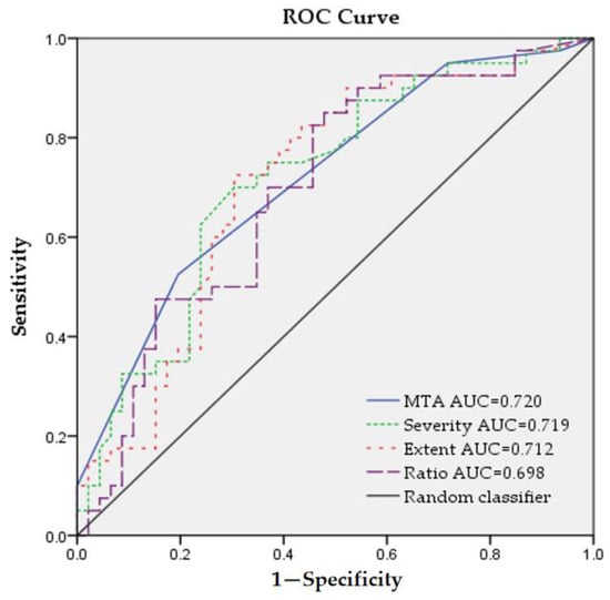 The MTA scale has been identified as a predictor of progression from MCI to dementia. One study reported that for every one-point increase in MTA score, the hazard ratio for MCI progressing to dementia increased by 1.5 during an average follow-up of 34 months []. Another study found that individuals with a mean MTA score greater than 2 were more than twice as likely to transition from MCI to dementia over a 3-year follow-up period []. As shown in Figure 2, the AUC for MTA closely approximated that for severity. However, it is important to note that a limitation of MTA is its subjectivity, whereas the eZIS provides a relatively objective assessment.