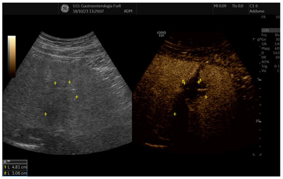 In order to assess early complications or residual tumor tissue, contrast-enhanced ultrasound (CEUS) examination was performed on postop day 1 (Figure 2).