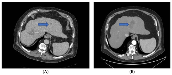 (A,B) show an example of a CT scan in a patient with a left lobar HCC nodule prior to (A) and at 1 month after (B) RFA (blue arrow indicating the HCC nodule).