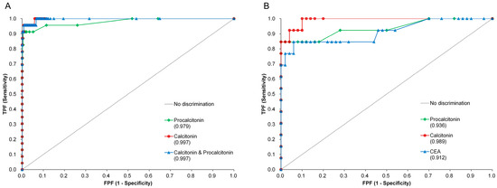 Diagnostic performances of calcitonin, procalcitonin (PCT), and carcinoembryonic antigen (CEA) for the discrimination of medullary thyroid cancer (MTC) from other histologic types of thyroid cancer. Calcitonin, PCT, and their combination showed excellent diagnostic performance for MTC diagnosis (23 cases and 1308 controls) with the area under the curve (AUC) values greater than 0.97, and the AUC values of the tests were similar to one another (A). In the subgroup of patients with CEA results (13 cases and 50 controls), the AUC values of calcitonin, PCT, and CEA were 0.989, 0.936, and 0.912, respectively, but they were not statistically different (B).