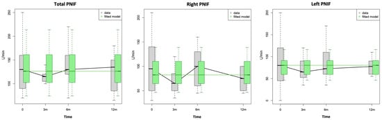 Box-plots showing distribution of total, right and left peak nasal inspiratory flow (PNIF) values at baseline (0) and at 3, 6 and 12 months following radiofrequency of inferior turbinates. The green fitted model was created by taking into account the influence of available variables.