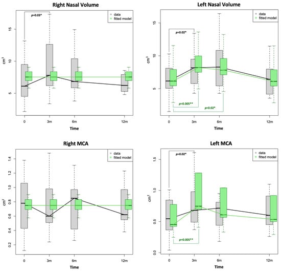 Box-plots showing distribution of right and left nasal volume and right and left minimal cross-sectional area (MCA) values at baseline (0) and at 3, 6 and 12 months following radiofrequency of inferior turbinates. The green fitted model was created by taking into account the influence of available variables. Note that differences in grey refer to the data whilst those in green refer to the fitted model. Level of significance according to p-values: * p ≤ 0.05, ** p ≤ 0.01.