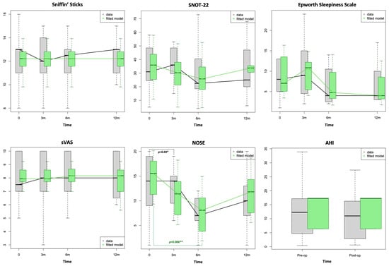 Box-plots showing distribution of patient-reported outcome measures values at baseline (0) and at 3, 6 and 12 months following radiofrequency of inferior turbinates. The green fitted model was created by taking into account the influence of available variables. Note that differences in grey refer to the data whilst those in green refer to the fitted model. SNOT-22: Sino-Nasal Outcomes Test-22; sVAS: Visual Analogue Scale for Smell; NOSE: Nasal Obstruction Symptom Evaluation; AHI: Apnoea–Hypopnea Index. Level of significance according to p-values: * p ≤ 0.05, ** p ≤ 0.01.