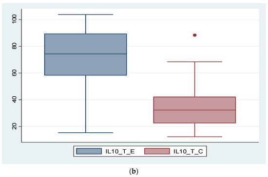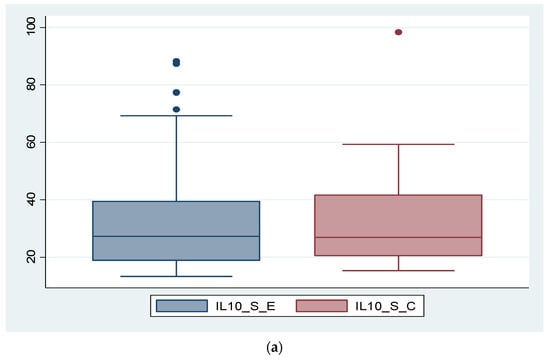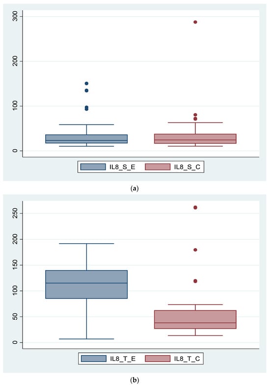 In the case of IL-10, its expression was significantly higher in tissue in the endometriosis group compared to the control group, while serum level did not show statistically significant values between the two groups. In the case of IL-10_S as well, there is a patient with an exceptionally high value, which can be considered an outlier. By removing this patient, the outcome remains unchanged; the difference between the two groups is not statistically significant (p = 0.473). The data are presented in Figure 3a,b and Figure 4.