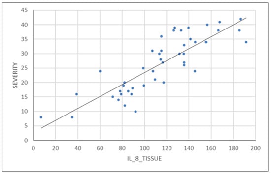 IL-8 is a pro-inflammatory chemokine involved in recruiting and activating leukocytes at the site of inflammation and is produced by endothelial cells, monocytes, macrophages, and fibroblasts. However, the specificity of this interleukin is relatively low, as it is elevated in other diseases such as rheumatoid arthritis, psoriasis, inflammatory bowel disease, or cancer. This fact is also confirmed in our study by the fact that the serum IL-8 levels do not differ significantly between the two study groups. However, IL-8 can still be useful when analyzing tissue expression, as values are statistically significantly higher in the endometriosis group compared to the control group, demonstrating that tissue levels of IL-8 are directly proportional to the severity of endometriosis, a fact clearly visible in Figure 1 of our study. Pathophysiological implications of increased tissue expression of IL-8 include the presence of chronic inflammation leading to neovascularization, stimulation of pain receptors, decreased egg quality, and subsequent infertility.