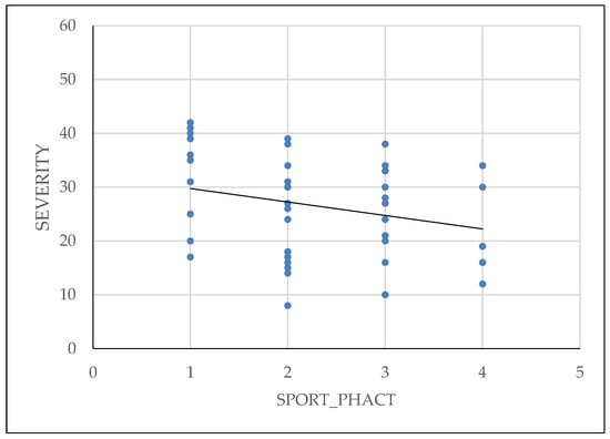 Another element investigated in the group of patients affected by endometriosis was related to physical activity practiced by the patient. The variable is defined as the maximum value declared by the patient to 6 questions in the questionnaire regarding the frequency, duration, and intensity of sports activities and physical activities outside of sports. This variable is defined as SPORT_PHACT.