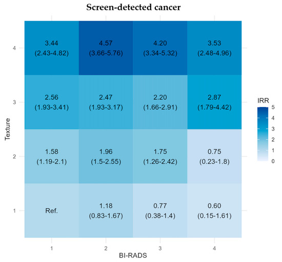 Identifying women for whom mammography will not provide adequate detection of breast cancer and with a high risk of being diagnosed with interval cancer in the near future could shorten the time to diagnosis, enabling a more efficient screening program through tailored screening. Increased breast density is associated with masking, as well as risk, complicating cancer detection in women with high density. Both density and texture have more impact on interval cancers, than on the screen-detected and LTC’s. We found that the lowest IRR for screen-detected cancer, and the highest IRR for interval cancer, were within the BI-RADS 4 category, probably reflecting the masking potential of high density, especially for BI-RADS category 4. In the BI-RADS 2–3 categories combined with high texture, the difference between the risk of a screen-detected and interval cancer was more balanced. However, studies have shown that masking is not limited to higher BI-RADS categories, and that textural features can predict masking beyond density [33,34,35]. Short-term risk prediction is useful for guiding tailored screening strategies. The IRR for interval cancer in the B3 + T1 subgroup was similar to that of B1 + T4, showing the diverse risk patterns across the BI-RADS categories, see Figure 3. Identifying women at their baseline screening according to the risk of interval cancer and masking, enables the possibility of offering them a shorter screening interval or supplemental screening modalities, including digital breast tomosynthesis, ultrasound, or MRI, targeting masking and potentially increasing cancer detection in a screening program [8,36].