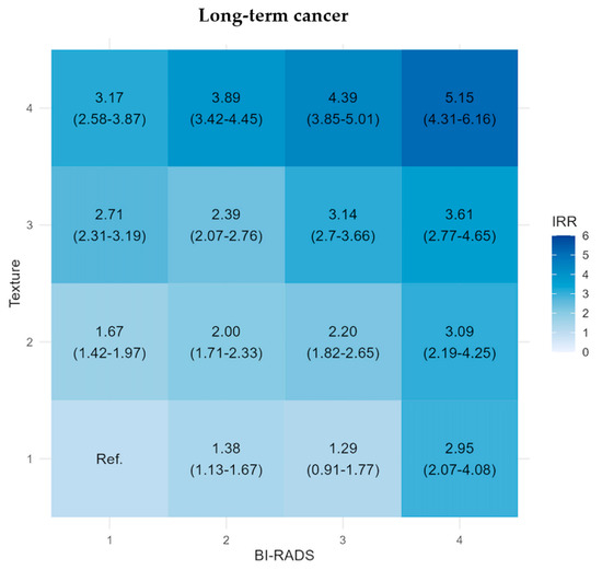 Long-term risk assessment can guide primary prevention efforts, in addition to tailoring screening strategies acknowledging that masking diminishes its impact on long-term breast cancer risk [17,37,38]. Selecting women with BI-RADS density 3 and 4 for supplemental screening would in our study encompass approximately 150,000 women or 35% of our cohort, with an IRR for LTC ranging from 1.29 (95% CI: 0.91–1.77) to 5.15 (95% CI: 4.31–6.16) through the subgroups. This would impose a considerable burden on a screening program and relying solely on BI-RADS density would lead to unnecessary or shortened screening intervals for low-risk, high density women, whereas women with low-density and high-risk would miss out on relevant screening [5]. Our results support further stratification beyond density, showing the highest rates for LTC where found primarily in the subgroups of the highest texture quartile.