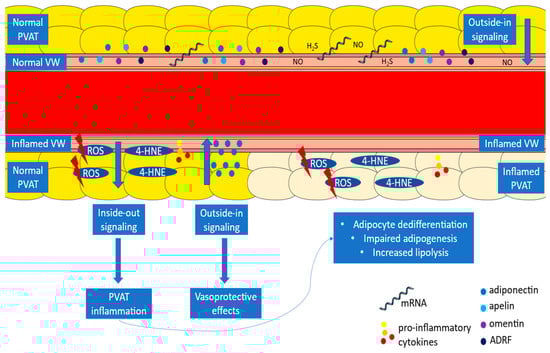 The interplay between PVAT and the vascular wall. ADRF: adipocyte-derived relaxing factor, mRNA: messenger ribonucleic acid, PVAT: perivascular adipose tissue, ROS: reactive oxygen species, VW: vascular wall, 4-HNE: 4-hydroxynonenal.