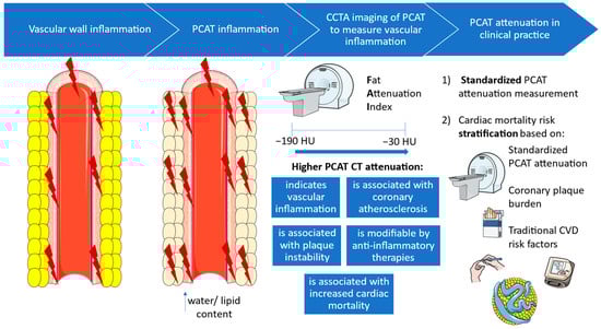 A recently developed and validated biomarker called the fat attenuation index (FAI) detects these inflammation-related changes in PCAT composition as an increase in PCAT attenuation in coronary computed tomography angiography (CCTA) images [6]. FAI overcomes many of the limitations inherent to previously developed biomarkers of vascular inflammation, is highly predictive of major cardiovascular disease (CVD) events, and may track dynamic changes in coronary inflammatory burden [6,8,11]. In this review, we summarize the role of PVAT in cardiovascular pathophysiology and the clinical implications of PCAT attenuation as a novel biomarker of coronary artery disease (CAD).