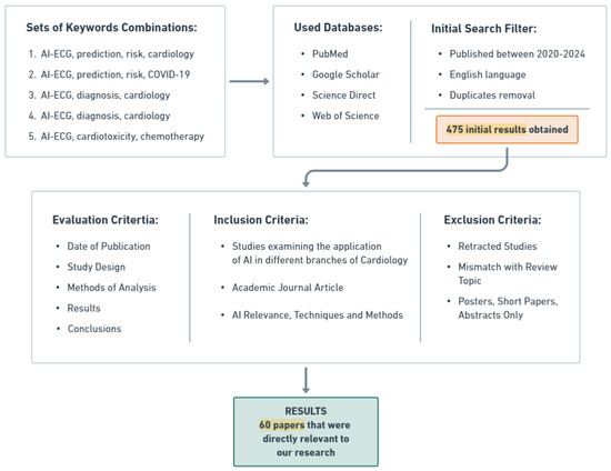 Our search strategy for identifying the relevant literature on AI-ECG in cardiology and COVID-19 involved a systematic approach, as illustrated in Figure 1. We performed a comprehensive review of the current literature, including original articles on various clinical applications of AI-ECG in cardiology and the COVID-19 pandemic. Extensive searches were conducted across PubMed, Google Scholar, Science Direct, and Web of Science databases to identify relevant manuscripts. We used five sets of keywords including AI-ECG, prediction, risk, cardiology, diagnosis, COVID-19, and cardiotoxicity.