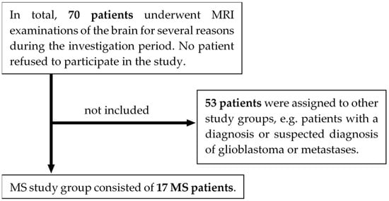 This prospective, exploratory study was approved by the institutional review board (Project ID 031/2021BO2). We adhered to the 1964 Declaration of Helsinki and its later amendments. Inclusion criteria were adulthood (≥18 years), a routine MRI examination to be carried out on the 3 T MAGNETOM Vida (Siemens Healthineers AG, Forchheim, Germany) scanner, and at least three of the following five MRI contrasts to be conducted: T1-weighted (T1w), T2w, T2*w, DWI, or T2w FLAIR. Moreover, a criterion for allocation to the MS study group was having MS according to the McDonald criteria (2017) [9]. Exclusion criteria were lack of capacity to consent, missing written informed consent, acute stroke in the lysis time window, or general MRI contraindications, such as non-MRI-compliant implants or severe claustrophobia. As can be seen in Figure 1, 17 MS patients underwent 3 T MRI scans of the brain between May 2021 and March 2022. For details on patient characteristics, see Table 1. All eligible patients gave written informed consent to participate in this voluntary study.