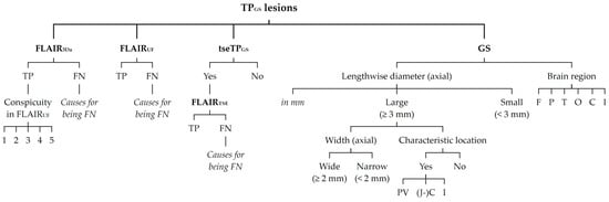 The following attributes were assigned to only a particular subset of the TPGS lesions (see also Figure 2): (1) lesion width (wide [≥2 mm] or narrow [<2 mm]; axial) and lesion location, according to Barkhof et al. and the McDonald criteria [6,7,8,9,13,65] (characteristic [periventricular, juxta-/cortical, infratentorial] or not characteristic) were both assigned to large (≥3 mm) TPGS lesions only; (2) lesion detectability in FLAIRTSE (TPTSE or FNTSE) was assigned to the subset of TPGS recorded with FLAIRTSE (tseTPGS); (3) lesion conspicuity in FLAIRUF compared with FLAIR3Da counterpart, using an ordinal five-point Likert scale (1 = better/larger in the FLAIRUF images; 2 = equal; 3 = better in the FLAIR3Da images, but classified as a lesion using only the FLAIRUF images; 4 = better in the FLAIR3Da images and classified as no lesion using only the FLAIRUF images; 5 = FLAIR3Da lesion that is not at all visible in the FLAIRUF images), was only assigned to the TP3Da lesions; (4) presumed causes for not being detected in FLAIRUF were only assigned to the FNUF lesions; (5) presumed causes for not being detected in FLAIR3Da were only assigned to the FN3Da lesions; (6) presumed causes for not being detected in FLAIRTSE were only assigned to the FNTSE lesions.