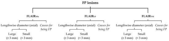 False-positive (FP) lesions were recorded and listed separately for FLAIRUF (FPUF), FLAIR3Da (FP3Da), and FLAIRTSE (FPTSE). To each FP lesion, the following attributes were assigned (see Figure 3): (1) size category, i.e., lengthwise axial diameter (large [≥3 mm] or small [<3 mm]); (2) presumed causes for being mistaken for a lesion.
