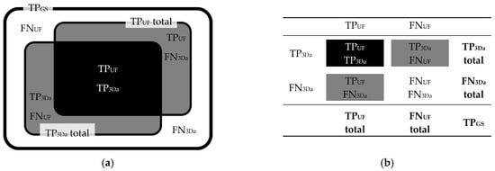 Correlations between TPUF, FNUF, TP3Da, FN3Da, and TPGS lesion counts. Schematic illustration (a) and contingency table (b). Note. TPGS = number of true-positive lesions detected using all contrasts available (gold standard); TPUF = true-positive lesions detected in the FLAIRUF images; FNUF = false-negative lesions using the FLAIRUF images; TP3Da = true-positive lesions detected in the FLAIR3Da images; FN3Da = false-negative lesions using the FLAIR3Da images.