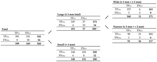 Correlations between TPUF, FNUF, TP3Da, FN3Da, and TPGS lesions are schematically demonstrated in Figure 4. Lesion counts are specified in Figure 5, classified by size (large, small, wide, narrow). All counts of total TP and total FN lesions, as well as FP lesions, in both the FLAIRUF images and FLAIR3Da images, were analyzed, compared, and grouped by size.