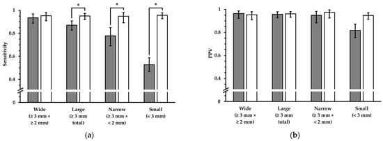 Sensitivity and PPV in terms of lesion detection, using FLAIRUF images (gray) and FLAIR3Da images (white). Four groups, which represent different lesion diameters, are displayed, respectively. The additional error bars denote the 95% CIs: (a) For wide lesions, no significant difference in sensitivity could be found. For the groups that comprise smaller lesions, however, the sensitivity was significantly inferior using the FLAIRUF images, decreasing more and more as a function of lesion diameter. (b) No significant differences in PPV were found for any of the large lesion groups (large, wide, and narrow). For small lesions, the PPV in the FLAIRUF images was moderately lower compared to the FLAIR3Da group (no overlap between confidence intervals). Note. Abbreviations as in Table 3. * p < 0.05.