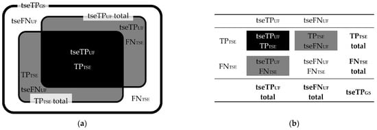 Correlations between tseTPUF, tseFNUF, TPTSE, FNTSE, and tseTPGS lesion counts. Schematic illustration (a) and contingency table (b). Note. TPGS = number of true-positive lesions detected using all contrasts available (gold standard); tseTPGS = subset of TPGS recorded with FLAIRTSE; tseTPUF = corresponding subset of TPUF recorded with FLAIRTSE; tseFNUF = corresponding subset of FNUF recorded with FLAIRTSE; TPTSE = true-positive lesions detected in the FLAIRTSE images; FNTSE = false-negative lesions using the FLAIRTSE images; further abbreviations as in Figure 4.