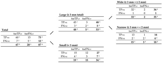 Contingency tables including a subset of those TPGS lesions covered by the FLAIRTSE sequence (tseTPGS). tseTPUF, tseFNUF, TPTSE, FNTSE, and tseTPGS lesion counts are correlated, and grouped by size, according to Figure 8. Note. Abbreviations as in Figure 8. 1 One was FN using FLAIR3Da; the rest were TP in FLAIR3Da. 2 Two were FN using FLAIR3Da; the rest were TP in FLAIR3Da. 3 Three were FN using FLAIR3Da; the rest were TP in FLAIR3Da. 4 Four were FN using FLAIR3Da; the rest were TP in FLAIR3Da. Lesion counts without superscripts were all TP in FLAIR3Da.