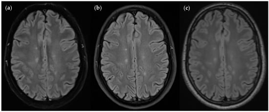 Multiple sclerosis (MS) is an inflammatory disorder of the central nervous system (CNS). Neuro-inflammation thereby results in demyelination and axonal damage with reactive gliosis and lesion formation leading to clinical disability progression [4]. MS is the most frequent demyelinating disease worldwide, with the highest prevalence levels in Europe and North America (over 100/100,000 inhabitants) [5]. Relapsing–remitting multiple sclerosis (RRMS) is the most frequent initial course of MS, and women are affected two to three times (or more) as often as men [5]. According to the McDonald criteria and its later revisions, dissemination of CNS lesions in time and space needs to be fulfilled for diagnosis, thus inevitably requiring appropriate MRI examinations [6,7,8,9]. Again, the diagnosis of MS entails further scans for disease activity and treatment monitoring [10]. For this purpose, a FLAIR sequence is an essential tool for cerebral imaging, and the availability of a fast imaging technique would be relevant in that context, given the high prevalence of this disease and the corresponding costs.