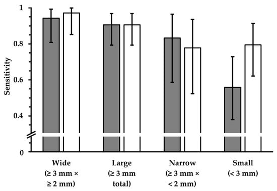 Sensitivity in terms of lesion detection, using FLAIRTSE images (white) and corresponding FLAIRUF images (gray). Four groups, which represent different lesion diameters, are displayed, respectively. The additional error bars denote the 95% CIs. No significant differences in sensitivity could be detected for any of the lesion groups (p > 0.05). For small lesions, however, the data suggest a lower sensitivity using the FLAIRUF images compared to the FLAIRTSE images. Results imply that there is a correlation between lesion detectability and size in both cases, though. Note. Abbreviations as in Table 7.
