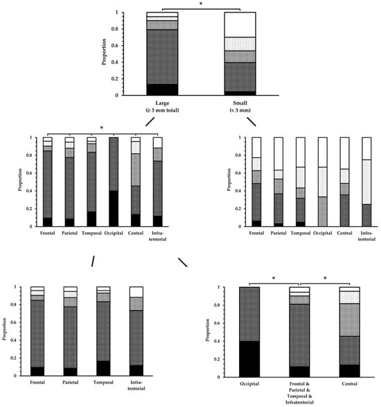 Conspicuity ratings of lesions in the FLAIRUF images, categorized by size and location. Lesion conspicuity was significantly superior for large lesions compared to small lesions. Unless for small lesions, there was a significant difference among some brain regions for large lesions. This could be attributed to occipital lesions (superior) and central lesions (inferior). Note. Black = 1; dark gray = 2; gray = 3; light gray = 4; white = 5. Abbreviations and brain regions as in Table 11. * p < 0.05.
