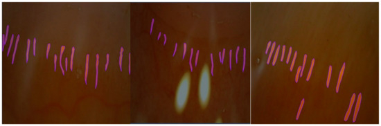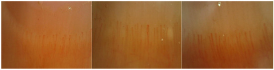 Each captured image was 3648 × 2736 in size. The collected data were converted to 640 × 640, 96 dpi, so that it could be fed to YOLOv8’s input. Each image was obtained from the proximal nail fold region and this image represented 3 mm horizontally and vertically. Figure 3 shows three different images of capillaries obtained from patients.