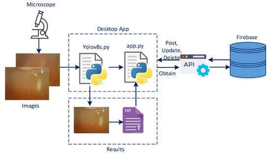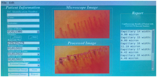 Tkinter GUI packages and the Python programming language were used to code the interfaces and integrate the system. The system’s numerical outputs were stored on Firebase, a free platform designed by Google for building web and mobile applications. Figure 6 shows a patient’s information, the nail fold image taken from the patient, the capillaries obtained with YOLOv8s, and the interface related to the report produced by the model.