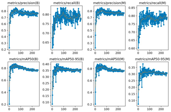 The training process was performed in Google Colab. During training, the Google Colab Pro + version was selected. Thus, the highest GPU usage was achieved with the Google Colab Pro+ version. The hyperparameters used for training the model are as in Table 1. Training accuracies for Boxes and Masks are as in Figure 8.