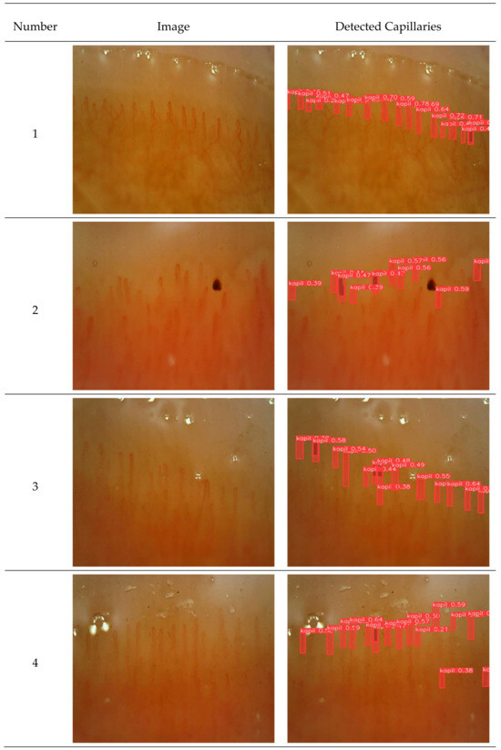 In this study, YoloV8s was used to automatically detect nail fold capillaries. A total of 777 nail fold images with a size of 3648 × 2736 were collected. Each image had a size of 640 × 640 and the horizontal and vertical resolution was 96 dpi. Figure 10 shows the capillary images of different patients and the capillaries detected in these images. The following procedure was applied for the width of each detected capillary.