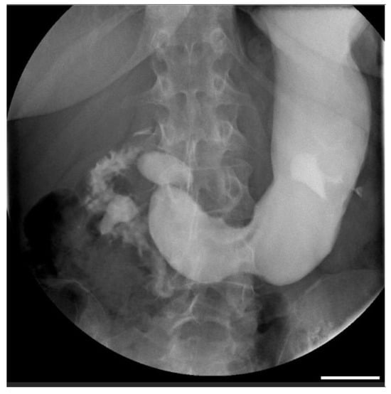 The antero-posterior projection of the UGI series showed the dilation of the stomach and second portion of the duodenum (scale bar: 1.5 cm).