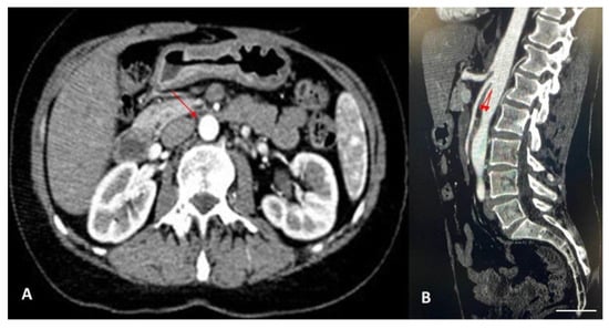 (A) Contrast-enhanced CT scan in axial projection showed the narrowing of the third duodenal portion between the aorta and the SMA (scale bar: 1 mm), as indicated by the red arrow (aorto-mesenteric distance of approximately 3 mm). (B) Contrast-enhanced CT scan in sagittal projection showed the narrowing of the third duodenal portion between the aorta and the SMA, with a reduction in the aorto-mesenteric angle of approximately 13° (scale bar: 1 mm), as indicated by the red arrow (normal values: 28–65°).