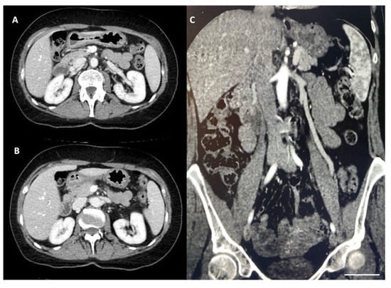 (A,B) Contrast-enhanced CT scan, in axial projection, showed the compression of the LRV (scale bar: 1 mm). (C) Reversal flow from the left gonadal vein in a coronal projection (scale bar: 1 mm).