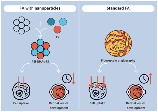 Nanotechnology has also been applied in fundus examination with fluorescein angiography, the gold standard screening in DR. Delivering intravenous fluorescein sodium (FS) through highly branched polyethyleneimine particles (PEI-NHAc-FS) reduces cellular uptake of the dye and its retention in the body, while maintaining optical performance comparable to free FS. Furthermore, it develops retinal vessels quicker, hence reducing the duration of fundus exposure to FS []. PEI-NHAc-FS are simple in preparation and have good biocompatibility and a high metabolic rate [] (Figure 1).