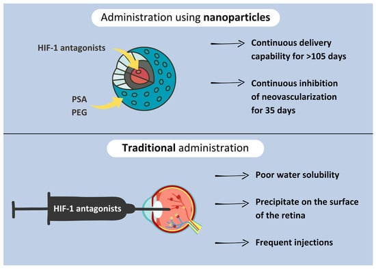 Detecting and treating hypoxia before it induces retinal neovascularization is key to delaying the onset of DR. Antagonists of the hypoxia-inducible factor-1 (HIF-1), which promotes the expression of such growth factors like PDGF and VEGF have proven effective in preventing DR. Two of such inhibitors, doxorubicin and daunorubicin, traditionally administered through frequent intraocular injections, have poor water solubility and precipitate on the surface of the retina. Nanoparticles (NPs) using polysebacic acid (PSA) and polyethylene glycol (PEG) enable continuous delivery of daunorubicin to the retina, even for more than 105 days in some rabbit models with continuous inhibition of neovascularization for 35 days. The delivery system seems to be non-toxic to the retina; however, further investigations in humans are necessary [] (Figure 2).