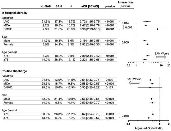 Various factors significantly modulated the association of SAH with poorer outcomes. In terms of in-hospital mortality, SAH for patients who underwent EVT in the DMVO location was associated with a particularly heightened risk of death (adjusted OR 6.99 [95%CI 2.99 to 16.3], p < 0.001; Figure 2), which was significantly elevated compared to MCA (interaction p = 0.003, Figure 2) and proximal LVO locations (interaction p = 0.014, Figure 2). Female sex was also significantly associated with an augmentation of increased mortality risk associated with SAH (interaction p = 0.009), though the absolute differences in rates of in-hospital death associated with SAH were similar for men and women (8.6% and 8.3%, respectively; Figure 2). Finally, older age (75 years or older) significantly augmented the reduced odds of routine discharge associated with SAH (interaction p = 0.018), though the absolute difference was smaller among elderly patients compared to younger patients (7.2% vs. 11.2%, Figure 2). No significant interactions were observed between SAH and all other variables captured in this study in terms of in-hospital mortality or routine discharge (all p > 0.05).