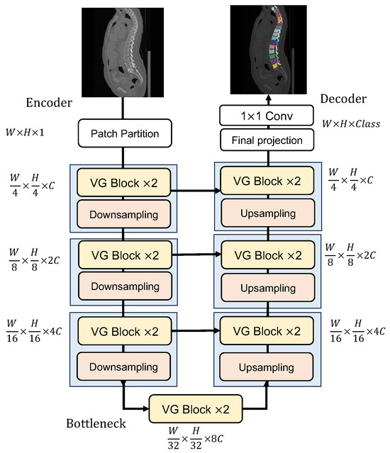 The overall architecture of the proposed Vertebrae-aware Vision Transformer (VerFormer) is demonstrated in Figure 1. The VerFormer is built as a U-shaped encoder-decoder architecture and consists of an encoder, a bottleneck, and a decoder. The overall architecture is designed based on a hierarchical Vision Transformer framework to obtain multi-scale feature representations. The basic block of our VerFormer is the Vertebrae-aware Global (VG) block, and two successive blocks are incorporated into each stage. The basic number of channels is , and the numbers of channels in the following stages are 192, 384, and 768. The number of channels in the bottleneck is 768. To extract more features in the deeper layers, the number of heads in the multi-head self-attention module at each stage is 2, 4, 8, and 16, respectively.