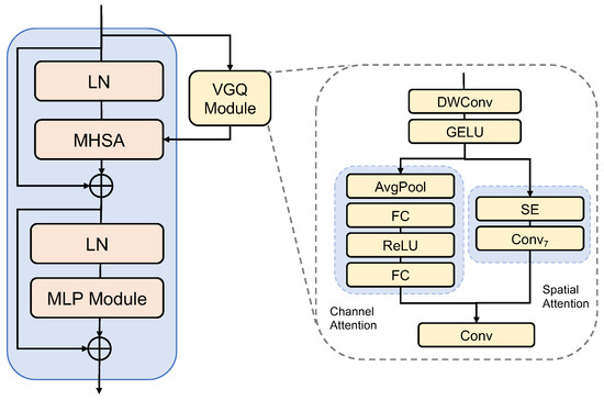 The overall architecture of the Vertebrae-aware Global (VG) block. In the VG block, a VGQ module is utilized to extract vertebrae-aware contextual information to highlight vertebrae-related query tokens. Then, these tokens are encoded in the multi-head self-attention (MHSA) module. In the VGQ module, two parallel paths are employed to extract global vertebrae-aware contextual information, including a channel attention path and a spatial attention path. In the channel attention path, an SE layer is used by cascading an average pooling (AvgPool) layer, a fully connected (FC) layer, a ReLu activation function, and a fully connected (FC) layer.