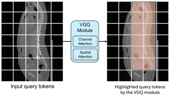 Each VG block employs a Vertebrae-aware Global Query (VGQ) module to extract vertebrae-aware contextual information based on attention mechanisms. Then, this attention information can be utilized to highlight vertebrae-related tokens and suppress non-vertebrae-related tokens. Figure 2 demonstrates the architecture of our Vertebrae-aware Global Query (VGQ) module. Figure 3 demonstrates the mechanism of our Vertebrae-aware Global Query (VGQ) module. In our VGQ module, a channel attention-based module and a spatial attention-based module are both used to extract vertebra-related contextual information. This channel attention-based module cascades a depth-wise convolutional layer (DWConv), a GELU activation function, a Squeeze-and-Excitation (SE) module [33], and a convolutional layer (Conv). This SE module consists of an average pooling (AvgPool) layer and two fully connected (FC) layers with a ReLU activation function in between. This channel attention-based module can be formulated as Equation (1).