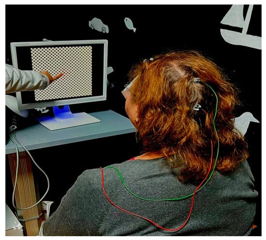 Visual rehabilitation sessions were performed using the Retimax Vision Trainer (CSO, Florence, Italy), a noninvasive rehabilitation method for improving visual performance in amblyopic patients by means of the detection of visual evoked potential (VEP) and auditory and visual biofeedback. Its main use is for electrophysiological studies, but it also enables us to obtain VEP examinations and real-time analysis during vision training. The protocol included 10 sessions, 2 per week, for a total of 10 min per session. Participants were seated in a dark, acoustically isolated room in front of a 42-inch monitor that had a central fixation target surrounded by black and white squares with pattern reversal, at a viewing distance of 1 m. The good eye was patched, and the patient wore the proper optical correction. Skin electrodes (Ag/AgCl) were applied as they are in VEP recording, namely, active electrode Oz on the occipital scalp over the visual cortex, the reference electrode at 2/10 between nasion and inion, and ground electrode Cz on the forehead. The fixation target was perceived by each patient prior to every session. By seeing the squared pattern, a bioelectrical signal is produced in the retina, visual pathways, and cortical areas. Detection of the signal is performed with electrodes and processed by the device with a Fast Fourier Transform. The amplitude at 15 Hz on the Fourier graphwhich is the pattern reversal frequency, characterizes the cortical activity triggered by the stimulus. The device returns an acoustic feedback of a frequency directly correlated to this amplitude. The size of the fixation target decreases in reverse correlation to the amplitude, thus also providing visual feedback (Figure 1).