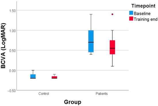 The control group showed no significant improvement regarding BCVA. There were some situations in which the control subjects were −0.1 LogMAR and improved post-training to −0.2 LogMAR (Figure 3).