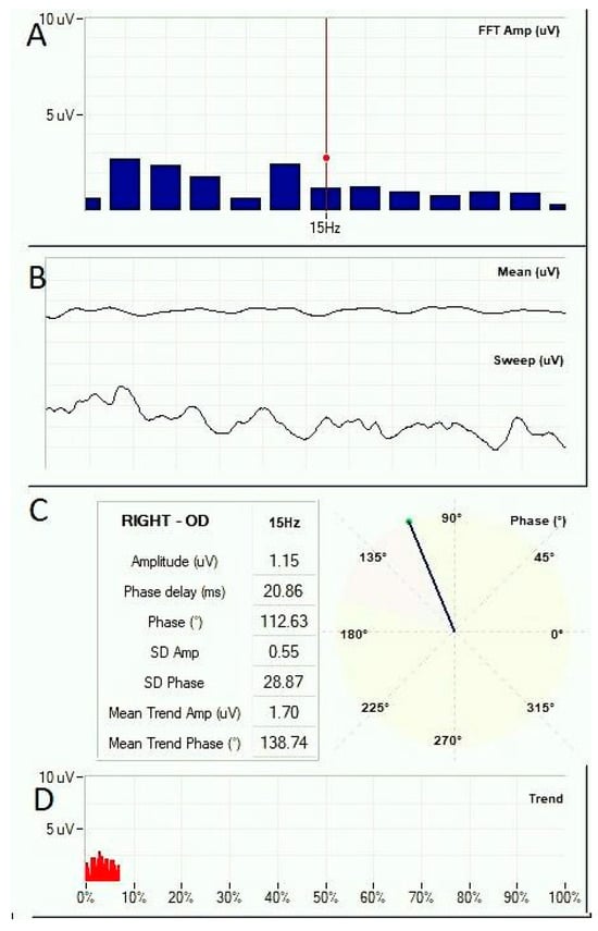 Snapshot of the Vision Trainer software 7.1.0 (Retimax, CSO, Firenze, Italy) during a training session. The SS-VEP waves are represented in the middle panel (B) in live signal form (Sweep) and averaged signal for the entire recording up to the live time point (Mean). Amplitude is represented on y-axis (uV) over time on x-axis (ms). Panel (A) shows the Fast Fourier Transform at the live time point represented in amplitude on y-axis (uV) over frequency on x-axis (Hz). Panel (C) presents VEP characteristics at 15 Hz, corresponding to the activity triggered by the 15 Hz pattern reversal stimulus. The first three values (Amplitude, Phase delay, and Phase) refer to the live time point, while the last four are standard deviation (SD) and mean values for the entire recording up to the live time point. Phase represents the cortical activity sinusoid shift from the stimulus wave. It is represented in degrees (also graphically on the left) as well as in time (ms). Panel (D) represents the amplitude trend across the training session, represented on x-axis as completion percent.