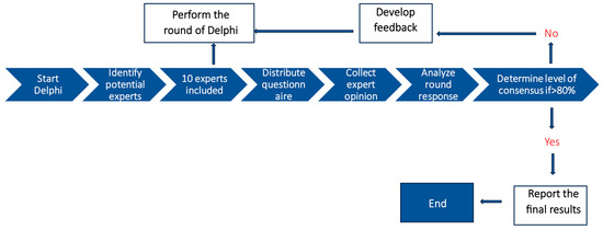 The Delphi method has been used in various medical and healthcare settings [23,24] to determine expert consensus in situations where there is insufficient evidence available [25]. The Delphi method is an effective process that uses multiple rounds of expert voting, in which a questionnaire is distributed to a group of experts who respond anonymously to the questions. The survey results are then arranged in a tabular form and reported back to the experts, and each panel is requested to complete the questionnaire once again [24] (Figure 2).