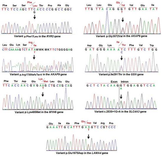 Among four cases that carried novel variants in the following genes: RYR2 (c.10498G>T, p.Asp3500Tyr, P1), AKAP9 (c.5187_5188dup, p.Arg1730llefsTer4, P2), MYH6 (c.1454A>T, p.Lys485Met, P7), and GSN (c.872T>C, p.Ile291Thr, P14), three variants (in the RYR2, AKAP9, and MYH6 genes) were evaluated as like pathogenic variants. Case P11 carried the following novel variants: c.4840G>A, p.Glu1614Lys (in the MYLK gene) and c.9215G>T, p.Gly3072Val (in the AKAP9 gene); however, variant c.4840G>A, p.Glu1614Lys in the MYLK gene was assessed as potentially damaging by CADD, version 1.7 (score: 36.0) and Polyphen version 2 (score: 0.611) software but as neutral by PhD-SNP (score: RI2) software. The variant c.9215G>T, p.Gly3072Val in the AKAP9 gene was evaluated as a neutral variant by CADD (score: 17.6), FATHMM (score: 3.76), and PhD-SNP (score: RI8) software while being evaluated as potentially harmful by Polyphen 2 (score: 0.973). Likewise, case P15 also carried the following novel variants: c.2535+1G>A (in the SLC4A3 gene) and c.5025A>T, p.Glu1675Asp (in the LAMA4 gene). The variant c.2535+1G>A in the SLC4A3 gene was evaluated as “exon-skipping” by the EX-SKIP software, “donor loss” by NetGene 2 version 2.42 and Spliceailookup software and as a damaging variant by MaxEntScan software (B in Table 3 and Table S2). The variant c.5025A>T, p.Glu1675Asp in the LAMA4 gene was assessed as a disease variant by PhD-SNP (score: RI4) and “probably damaging” by CADD (score: 23.6) and Polyphen 2 (score: 0.998), but it was assessed as a “tolerated variant” by FATHMM (score: −1.32) and “benign” by Mutation taster (score: 21) (A in Table 3). Based on the above-predicted results, the c.2535+1G>A variant in the SLC4A3 gene can be considered the cause of the disease in case P15.